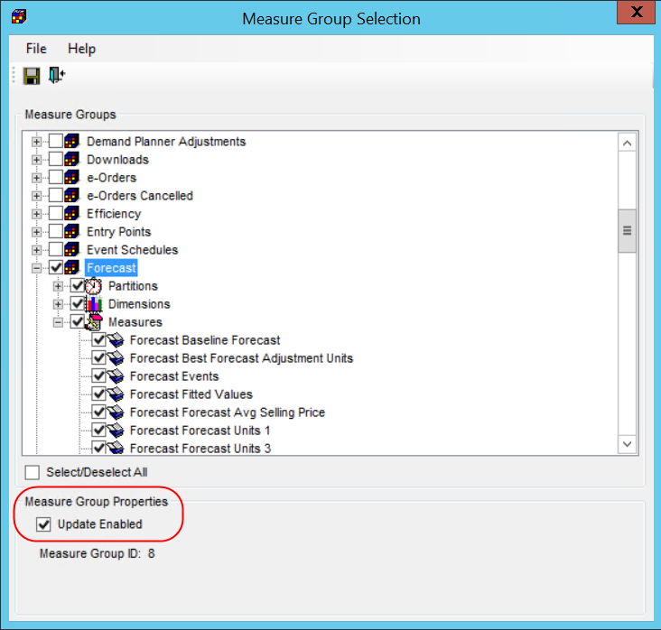 Changing the Update Enabled setting will change the Update checkboxes in the Stratum.Viewer Role Maintenance window. Here is the Measure Group selection window after Update Enabled was de-selected for Forecast.