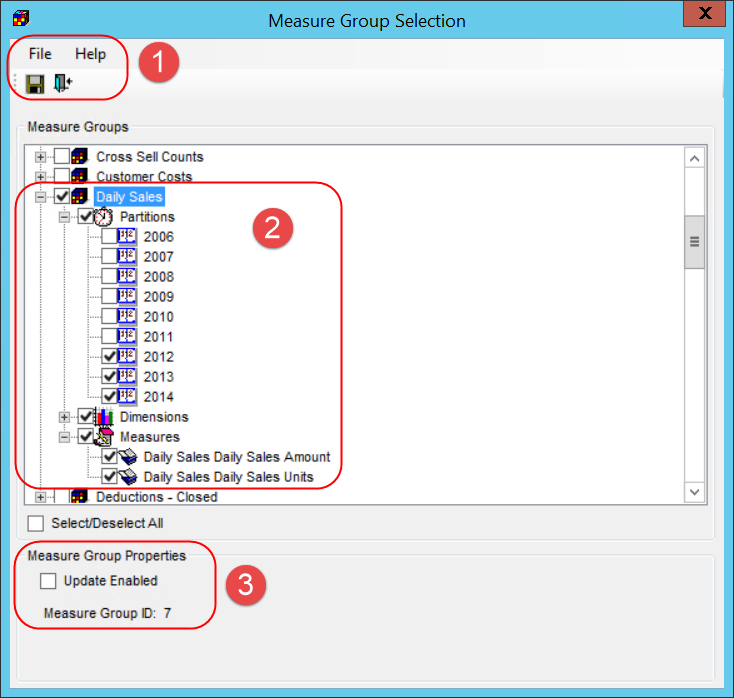 Measure Groups - Use this section to select or de-select the measure groups and related objects for your database -- the partitions, dimensions, and measures.
