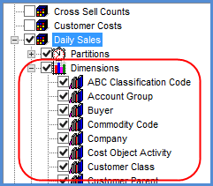 The prior image shows an example of an expanded Measures node, in this case for a Daily Sales measure group. Here are examples of the expanded Partitions and Dimensions nodes for that group. Note that Stratum.Viewer will only display data for the measures selected from a group in relation to the selected partitions and dimensions. For example, data from the 2012 partition would not display for Daily Sales in Stratum.Viewer if that partition wasn’t selected for it in Stratum.Connector for Viewer.
