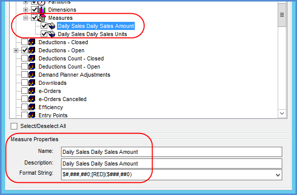 Measure Group Properties -- If you click a measure group, an Update Enabled checkbox displays at the bottom of this window. The checkbox is deselected by default. Selecting the checkbox will allow Stratum.Viewer administrators to give users Update access to any measures in the group for planning purposes. Also, the unique ID associated with this group displays at the bottom of the window. Measure Properties – If you click an individual measure in the group, you will see its properties at the bottom of this window. All properties can be edited. Note: All properties will remain disabled in the case of measures that haven't been selected for your database and in the case of partitions and dimensions.