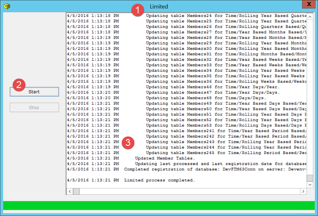 Log Information - The main area of the widow displays general information about the process. Information logged includes general information such as the application version and names of the Analysis Services database, Stratum.Server database, and their servers. For a Full, Limited, Post, or Standard process, additional information displays in the window – that detailed information includes the date and time when each line item for the process was started and completed and line items regarding the overall successful completion or errors in the process. Typically log information does not appear in this window until the process has completed. Thus, another option for viewing log information during processing is to open log files from the Log folder in the application directory. |
