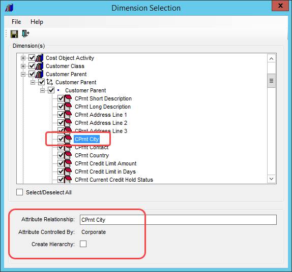 Corporate Controlled Attribute Relationships – Their values originate from your Corporate busines systems and are stored in your Stratum.Server database. They can be selected for use and maintained in Stratum.Connector. Change their names, create hierarchies from them, and select or deselect them to control availability in Viewer. The next image shows the CPrnt City attribute relationship, which is Corporate controlled and belongs to the Customer Parent level.