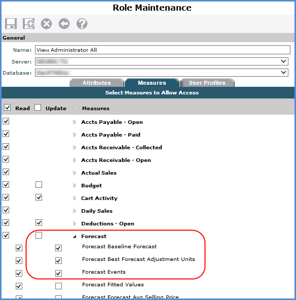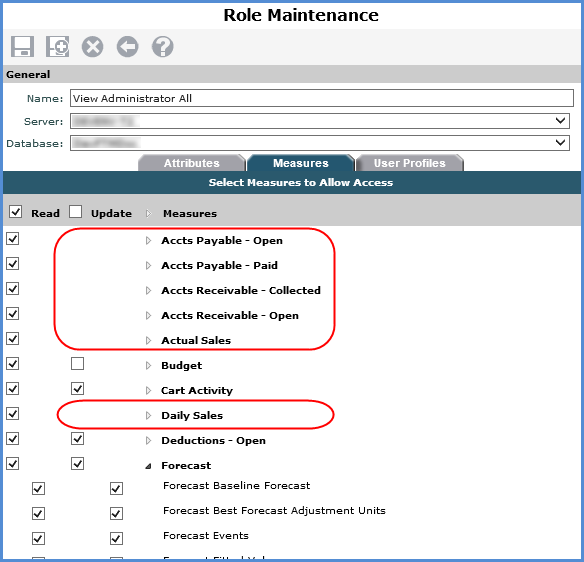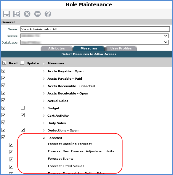 The next image shows an example of the Role Maintenance window in Stratum.Viewer. The circled measure groups (Categories) do not have Update checkboxes because they were not Update Enabled in Stratum.Connector. Stratum.Viewer users cannot be given Update access to measures in any of those groups. The remaining measure groups, including Budget and Forecast, have Update checkboxes because they were Update Enabled in Stratum.Connector. By default, the Update checkboxes for those measure groups will be de-selected in the Role Maintenance window for all roles. Stratum.Viewer security administrators can give Update access to any measures in those groups by selecting their Update checkboxes. The second image shows a role that has been given Update access to a few Forecast measures.