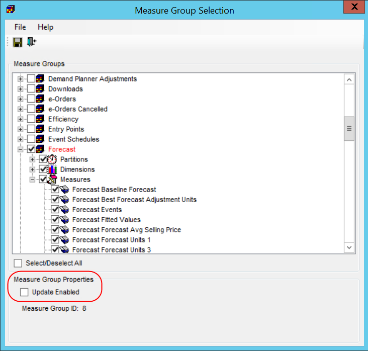 Changing the Update Enabled setting will change the Update checkboxes in the Stratum.Viewer Role Maintenance window. Here is the Measure Group selection window after Update Enabled was de-selected for Forecast.