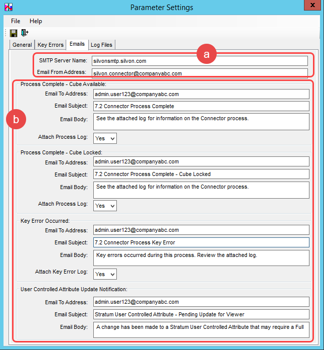 Use this tab to control properties for the emails that Stratum.Connector for View generates to keep administrators informed about the status of processing the Analysis Services database and cube. Settings for each type of email also allow you to determine if copies of log files for a process will be attached to the email that is generated.