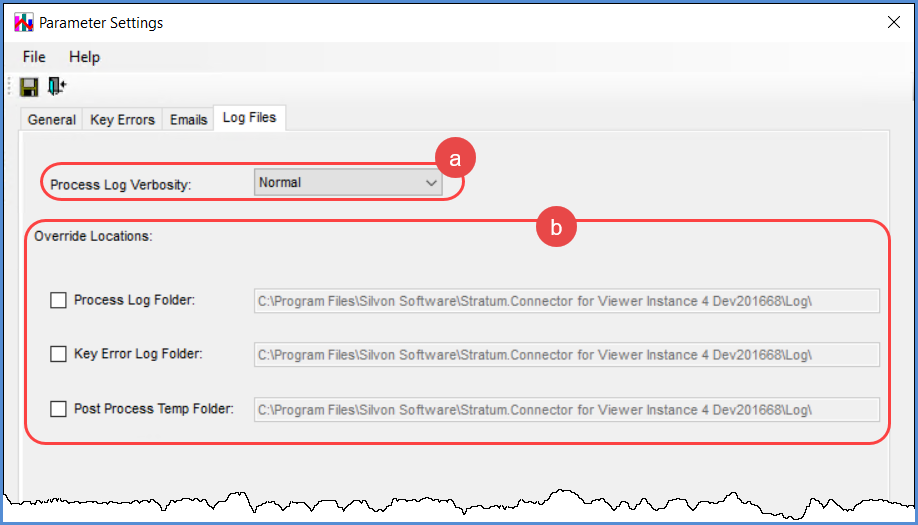 Override Locations – By default, log files for database processing are stored in the Log folder of the Stratum.Connector main application folder. You can customize the location of any of the three types of log files listed in this tab. Select the checkbox of the log file type that you want to customize settings for, and enter your override changes for that log. The log file locations you can override are: