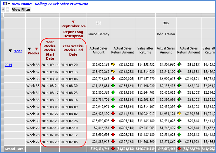 The first example is a view that shows sales versus returns for a rolling period of 12 weeks (the current week and eleven weeks prior). The Weeks level in the view belongs to the Year Weeks time hierarchy. There are two time properties showing for Weeks -- the Start Date and End Date. These properties make it easy to tell what calendar dates fall within each week currently displayed in the view.