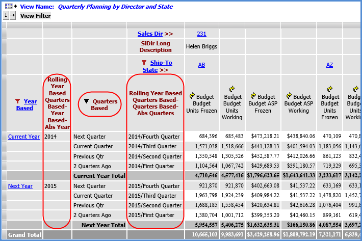 The next example view shows information about Current Year and Next Year Budget details by quarter. Time properties for the Year Based level tell me that Current Year is 2014 and Next Year is 2015. Time properties for the Quarters Based level tell me which quarter and year are represented by Next Quarter, Current Quarter, Previous Qtr, and 2 Quarters Ago. The Quarters based level is sorted to organize quarters from most current to least current.