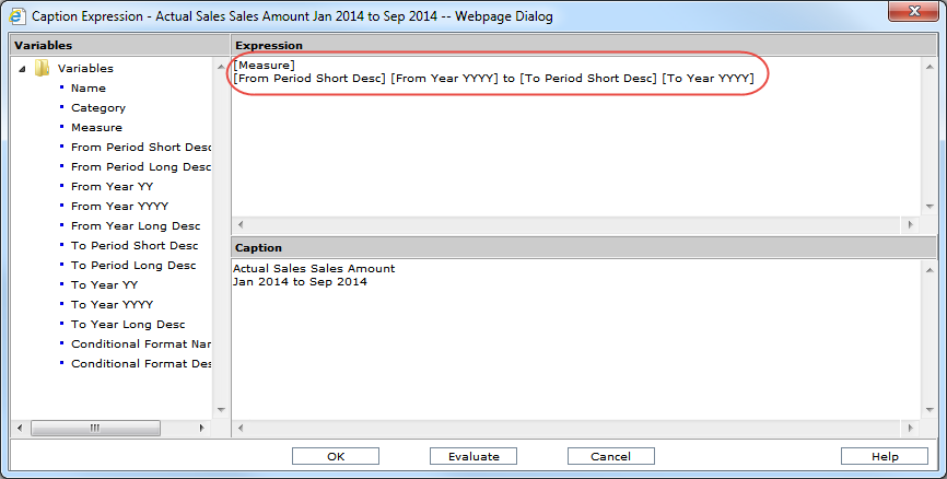 The same expression syntax was used for both measure items. Four of the From and To variables were used to build the caption expression – From Period Short Desc, To Period Short Desc, From Year YYYY, and To Year YYYY.