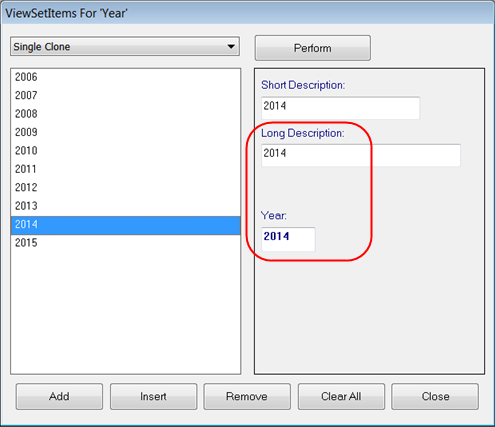 The four digit Year from the corresponding ViewSetItem is used for the From and To Year YYYY variables in our example. If our example caption had used the From and To Year YY variables, then only the last two digits of the Year from the corresponding ViewSetItem would have been used. And if our example caption had used the From Year or To Year Long Desc variables, then the Year Long Description from the corresponding ViewSetItem would have been used in the evaluated expression in the grid.