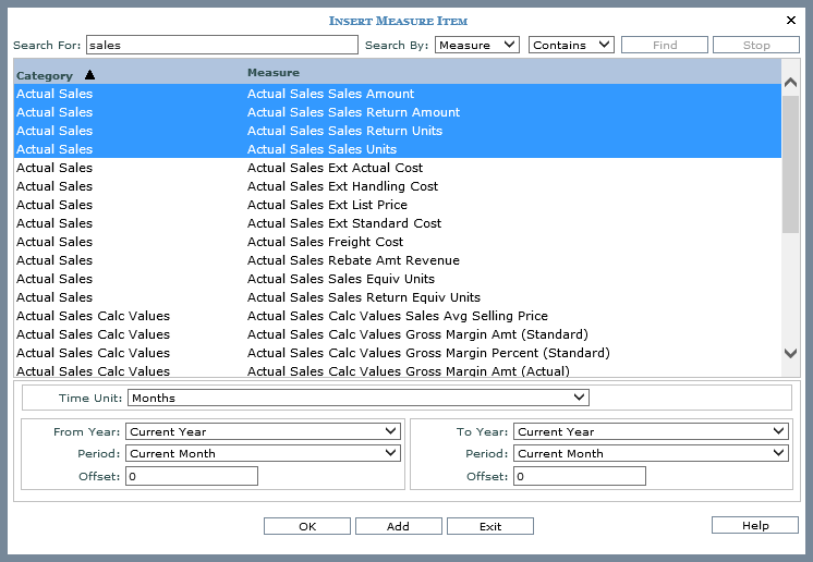 Here are the time units displayed in the Insert Measure Item window. The list of available Time Units is based on the Stratum.Planner ViewGroup associated with the selected measures.
