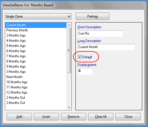 The From Period and To Period drop-down lists in the window will be populated with the applicable time unit’s absolute and based periodic ViewSetItems – in this example they are from the Months Based and Months ViewSets. The months will display based on the priority of their associated ViewSets. In this example, the Based Months ViewSet has a lower priority than the Months ViewSet, therefore the based months appear before the absolute months. The ViewSetItem defined as the Default for the based ViewSet will be selected by default for the From Period and To Period drop-down lists. The Default ViewSetItem in this example is Current Month.