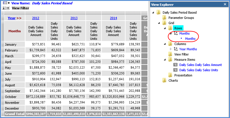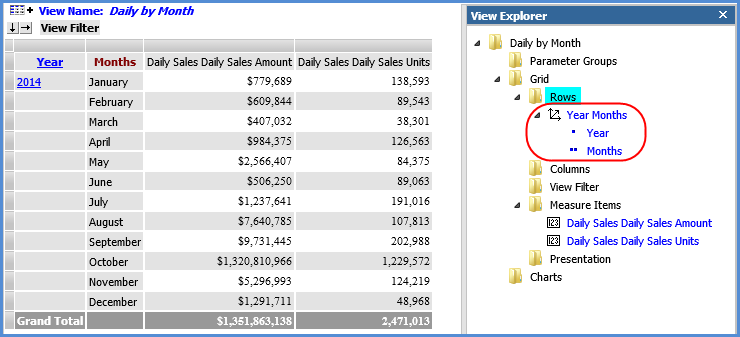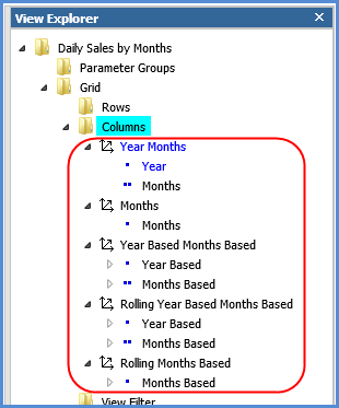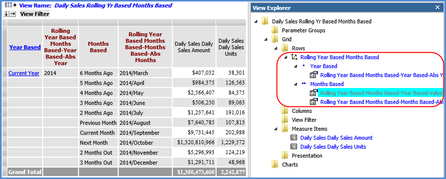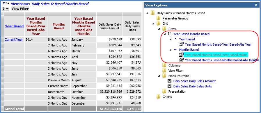 The following view explorer example and table show the levels for the hierarchies. Here are the Months and Months Based hierarchies and levels as seen in view explorer.