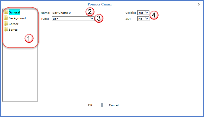 | Visible - You control whether or not the chart is visible. If you select No to hide the chart, it can be made visible again via view explorer. For more information, see the Hide a Chart topic. 3D - You control whether or not the chart displays three dimensional. |