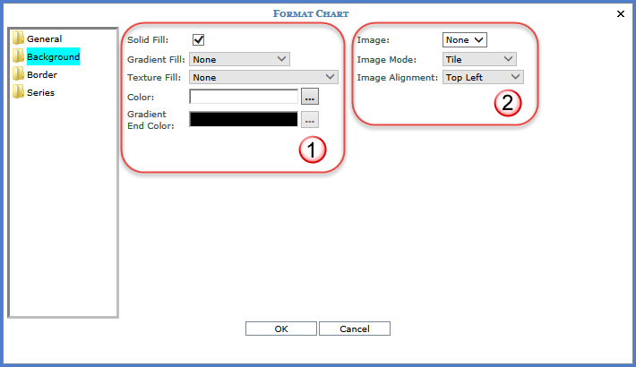| Image - You can select an image which had been saved to the images\charting\backgrounds\folder of the Stratum.Viewer product directory. This functionality is disabled if there is not an image available. Valid image types are .gif, .jpg, .tif, bmp, and .png. Image Mode - If an image is included in the chart background, it can be tiled, flipped, or scaled. Image Alignment - If an image is included in the chart background, you determine where it will be positioned. |