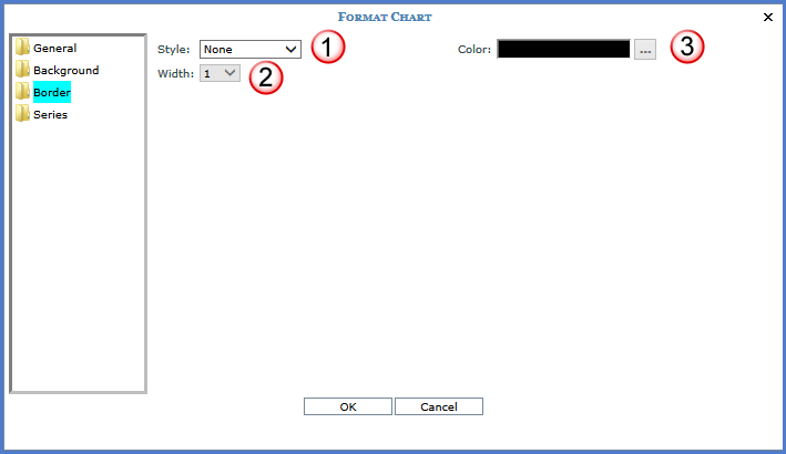 | Style - A border can be defined for the chart. If a style is selected, the Color and Width properties are enabled. Styles to choose from are Dash, Dash Dot, Dash Dot Dot, Dot, and Solid. You must select a width and color for the specified border style to be visible. |