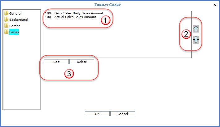 | All of the chart’s series display in this area and are available to select for maintenance, deletion, or reordering. |