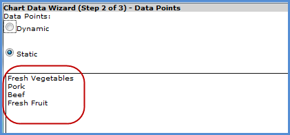 Data Points: Static - If the data points are static, only the selected rows or columns will be charted. If you select Static, options display to select the values for the data points. Clicking Add opens an additional selection window similar to the window for static series. See Chart Data Wizard (Step 1b of 3) – Static Data Points. |