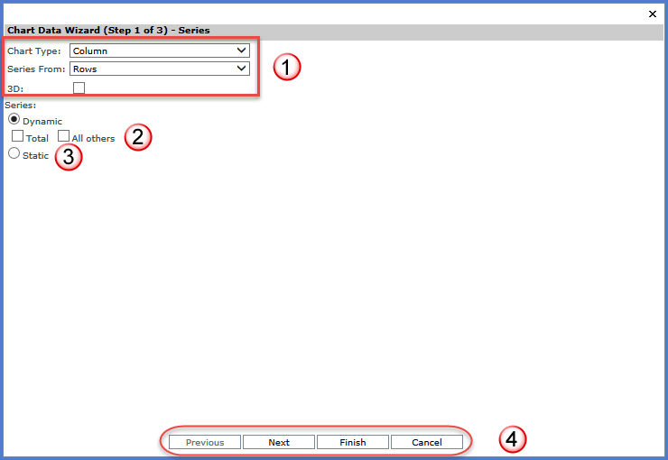 Series: Dynamic - All grid rows or columns will be charted when the series are dynamic. Totals and All Others - Options are provided for showing Totals and All others data when series are dynamic. Dynamic series will graph all rows or columns displayed in the view grid. Notes: Series and data points can be a mixture of dynamic or static in your chart. For example, series could be dynamic while data points are static. |