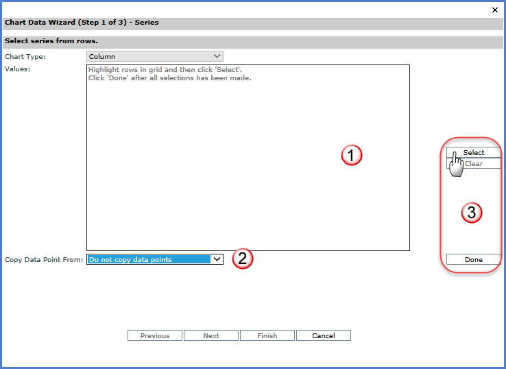 Select - Clicking Select (in both the Y-Values and the X-Values area) will add the selected rows or columns from the Viewer grid as data points for the chart. Clear - Clears any values currently selected and displayed on the window. Done - Click Done to complete the process of defining the static data points and redisplay the Chart Data Wizard (Step of 2 of 3) – Data Points window with the static data points identified.
