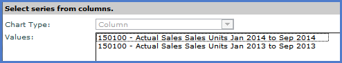Chart Type - The selected chart type is displayed here. When the chart type is set to “Combinational”, Chart Type must be defined for each series. Chart type is display only for all other chart types. Values - Displays the static series for the chart. To add new series, click Select within the Chart Data Wizard window; the highlighted measure items or members from the grid are added as static series for the chart and display in this area.