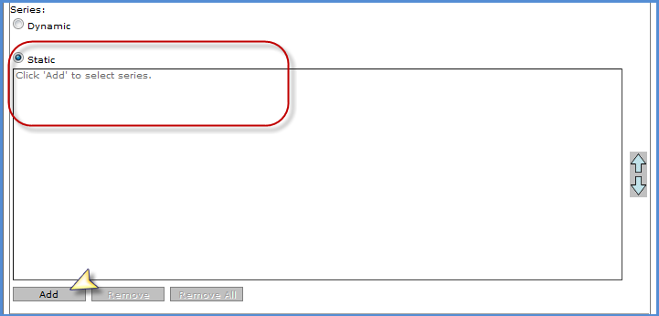 Series: Static - If the series are static, only the selected rows or columns from the grid will be charted. If you select Static, options display to select the values for the series. Clicking Add opens an additional selection window. See Chart Data Wizard (Step 1b of 3) – Static Series.