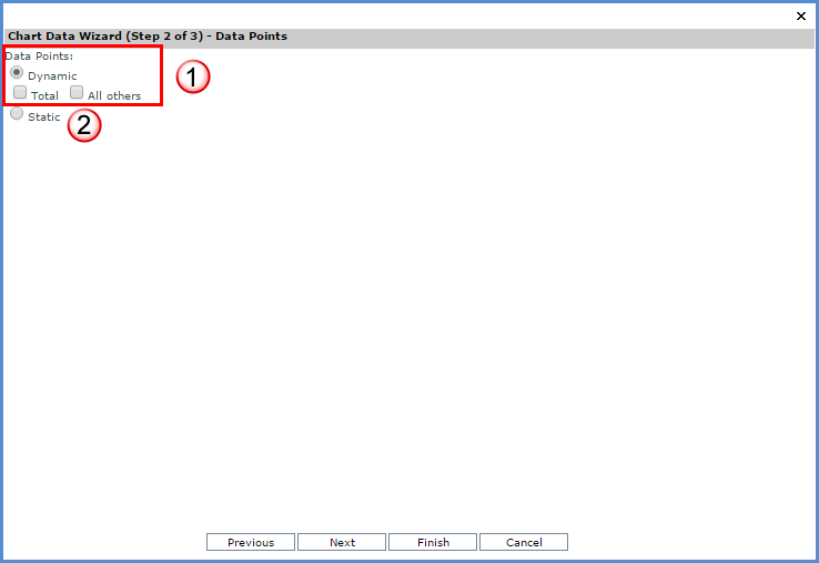 Data Points: Dynamic - Data points can be created from either the rows or columns of the grid. If series were defined from the rows, then data points will be the grid’s columns, and vice versa. All grid rows or columns will be charted for dynamic data points. Totals and All Others - Options are provided for showing Totals and All others data when data points are dynamic. Dynamic data points will graph all rows or columns displayed in the view grid. |