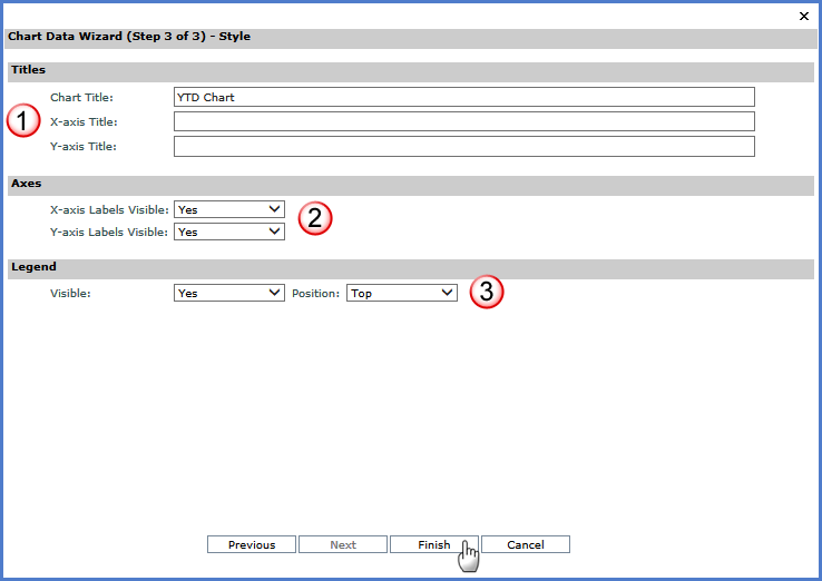 Next, Finish, Cancel - Click Next to define the chart’s data points, Finish to complete the chart without further customization, or Cancel to close the Chart Data Wizard without creating a chart. |