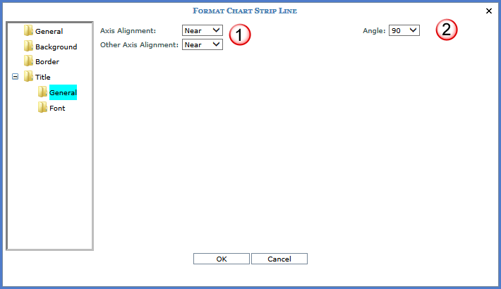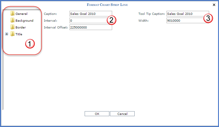 Caption - Use this field to specify a strip line caption. You control the position of the caption from the Title folder on this window. See Format Chart Strip Line – Title; General. Interval - Controls the frequency that the strip lines appear for the axis. For non-numeric axes, a selection of 1 indicates that the lines display for every value. A selection of 2 indicates the lines display on every other value, and so forth. For numeric axes, enter an appropriate interval based on the scale of the chart. If values range from 100 to 1,000, an interval of 100 would be an appropriate value. Interval Offset - Determines where the first strip line appears. For numeric axes, enter the value where this first grid line should display. For non-numeric axes, enter the number of the value collection where the first grid line should appear. |