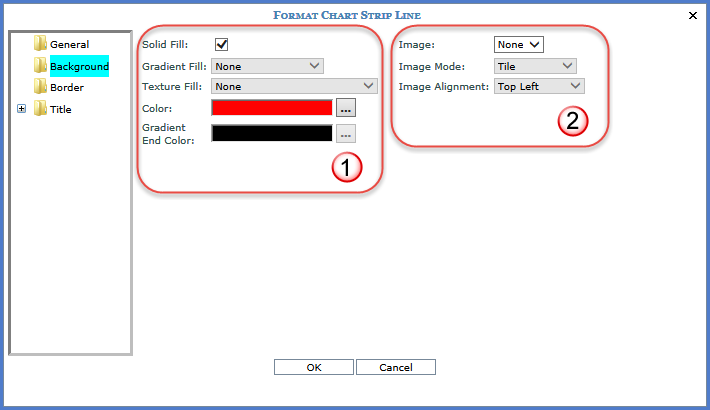 Image - You can select an image which had been saved to the images\charting\backgrounds\folder of the Stratum.Viewer product directory. This functionality is disabled if there is not an image available. Valid image types are .gif, .jpg, .tif, bmp, and .png. Image Mode - If an image is included in the strip line background, it can be tiled, flipped, or scaled. Image Alignment - If an image is included in the strip line background, you determine where it will be positioned. |