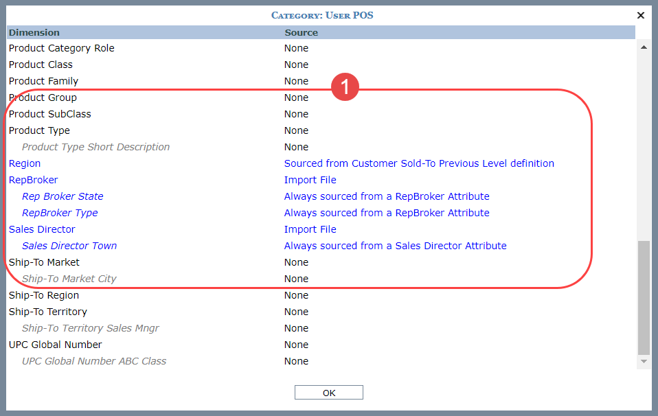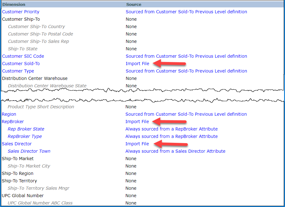In the following example, the import was directly mapped to the Customer Sold-To, RepBroker and Sales Director dimensions. Therefore, their source is Import File. All virtual dimensions under those dimensions (RepBroker State, RepBroker Type,and Sales Director Town) will have their data sourced from their associated parent dimensions. Four other dimensions will have their data sourced from previous level definitions– they are Customer Priority, Customer SIC Code, Customer Type, and Region.