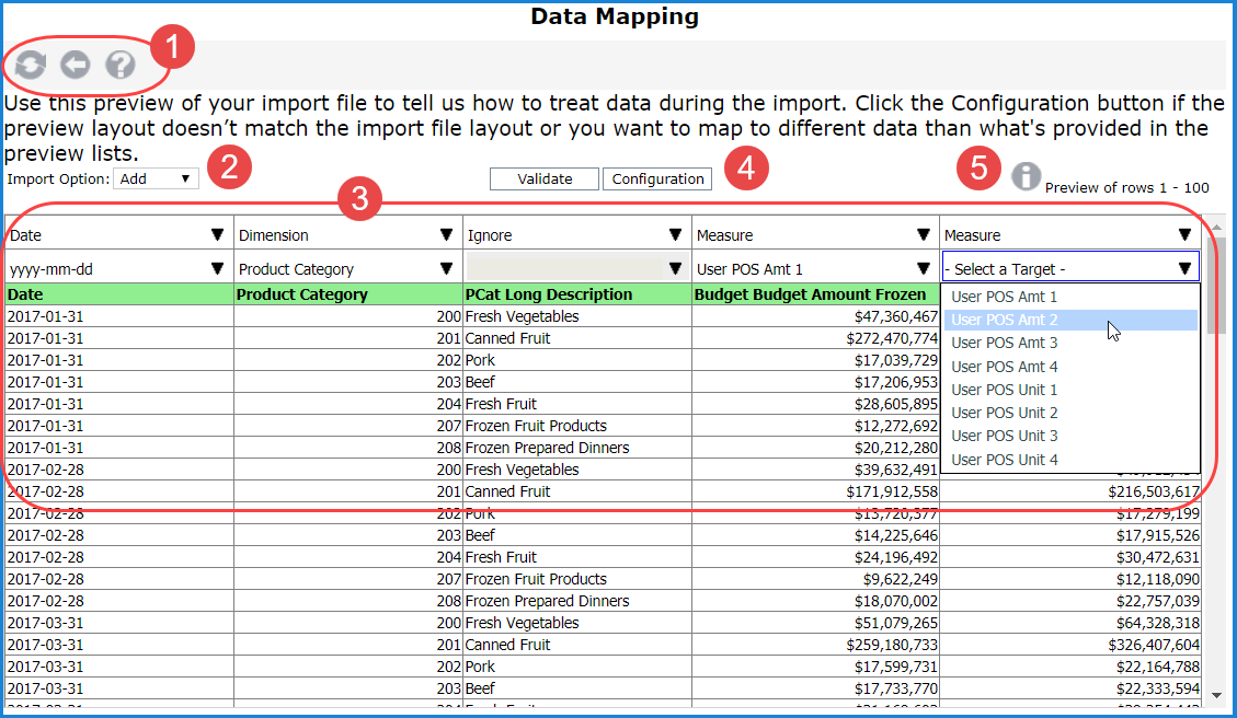 Import Option – Change this option if needed after initial configuration Choose to Add the imported data or Replace existing data with imported data. A Replace clears existing data from ALL measures of the Target category then adds the new data. |