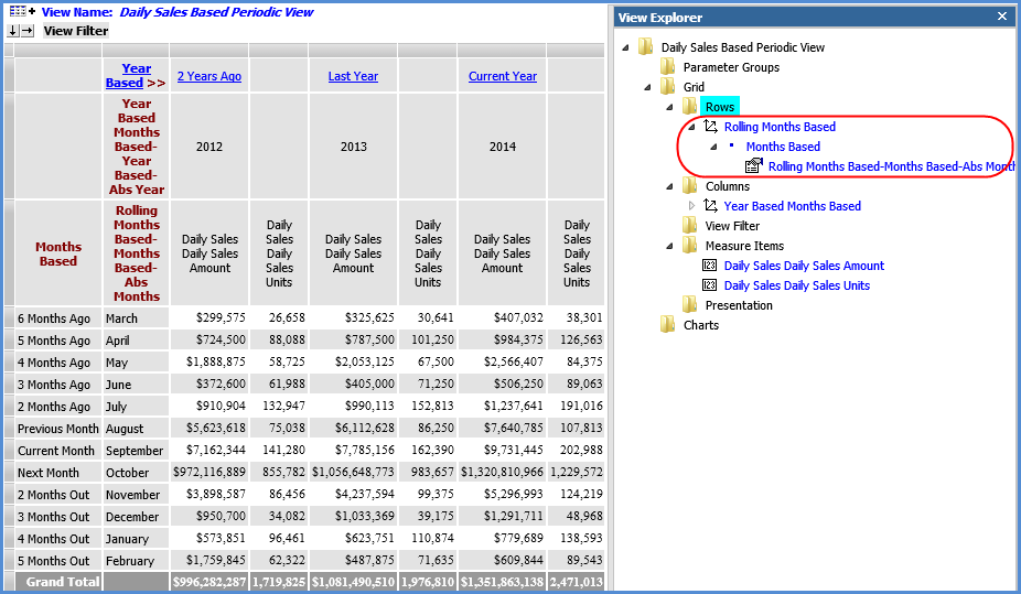 2. The second hierarchy is Rolling Year Based Months Based, and it also contains two levels. The first level is Year Based, for the associated based year ViewSet. The second level is Months Based, for the based periodic ViewSet. This time hierarchy can be used to create period based views that allow users the ability to see a rolling set of periods that can cross year boundaries. Since the members for a rolling based year do not have to belong to the same absolute year, this hierarchy should not be used in views that show annual data.