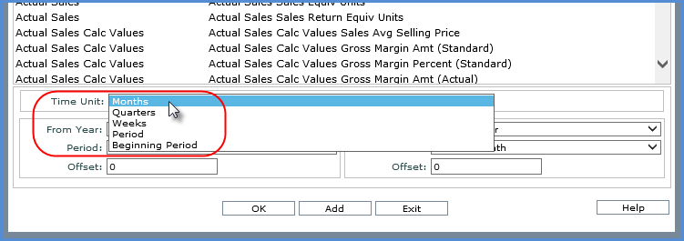 Here are the time units displayed in the Insert Measure Item window. The list of available Time Units is based on the Stratum.Planner ViewGroup associated with the selected measures.