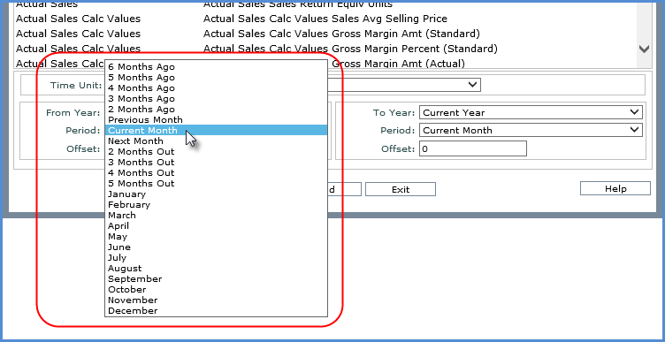The From Period and To Period drop-down lists in the window will be populated with the applicable time unit’s absolute and based periodic ViewSetItems – in this example they are from the Months Based and Months ViewSets. The months will display based on the priority of their associated ViewSets. In this example, the Based Months ViewSet has a lower priority than the Months ViewSet, therefore the based months appear before the absolute months. The ViewSetItem defined as the Default for the based ViewSet will be selected by default for the From Period and To Period drop-down lists. The Default ViewSetItem in this example is Current Month.