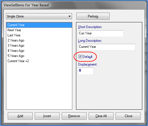 The From Year and To Year drop-down lists in the window are populated with the ViewSetItems from the absolute and based year ViewSets associated with the ViewGroup – in this example the Year Based and Years ViewSets. The years will display based on the priority of their associated ViewSets. In this example, the Based Year ViewSet has a lower priority than the Year ViewSet; therefore, the based years appear before the absolute years. The ViewSetItem defined as the Default for the based ViewSet will be selected as the default for the From Year and To Year drop-down lists. The Default ViewSetItem in this example is Current Year.