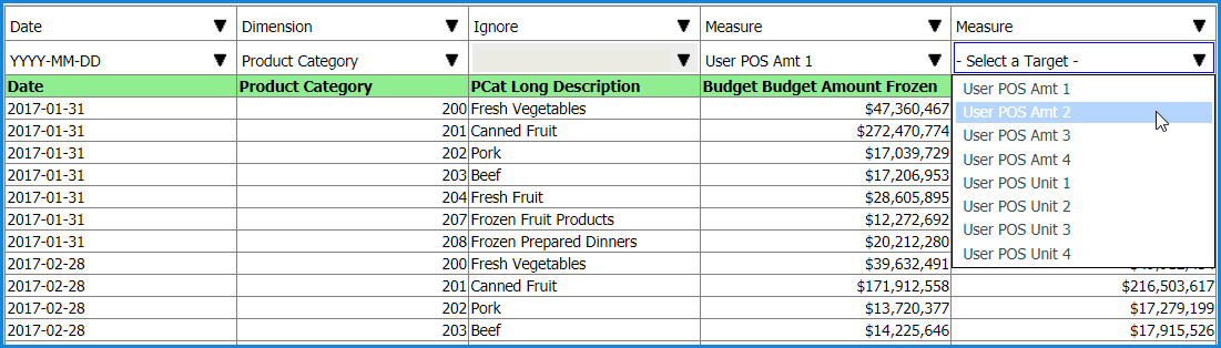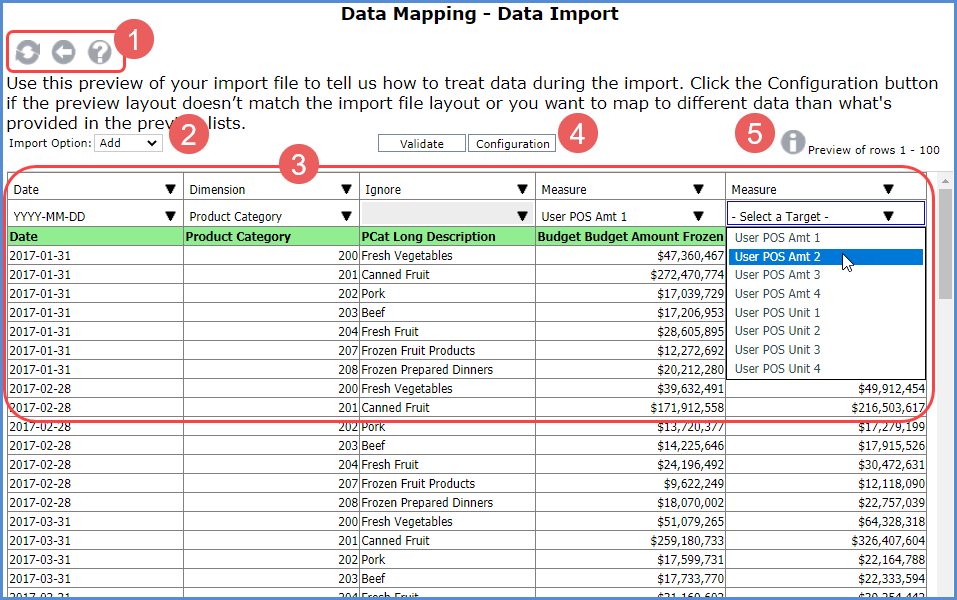 Import Option – Change this option if needed after initial configuration Choose to Add the imported data or Replace existing data with imported data. A Replace clears existing data from ALL measures of the Target category then adds the new data. |