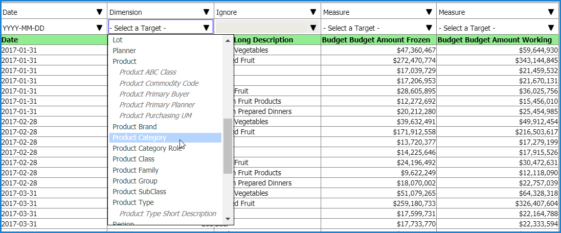 Category Information – Click to open details about the category you have identified as the import’s Target category (the one to receive imported data). The window tells you which dimensions you’ve mapped to and identifies others belonging to the category that will be impacted by the import. See the Category Information Window topic to learn about details displayed in this window. |