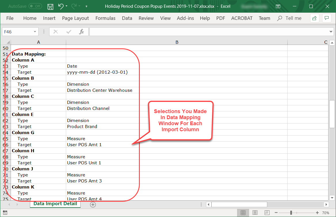 Next section shows each column in your import file and how it was mapped to Stratum items in the Data Mapping window. The section shows if a column was set to Dimension, Measure, or Date. You’ll only see a Date column in reports for Transactions type imports. The Data Mapping section of the report also shows what format was selected for a Date column (when applicable) and the Stratum target for Dimension and Measure columns.