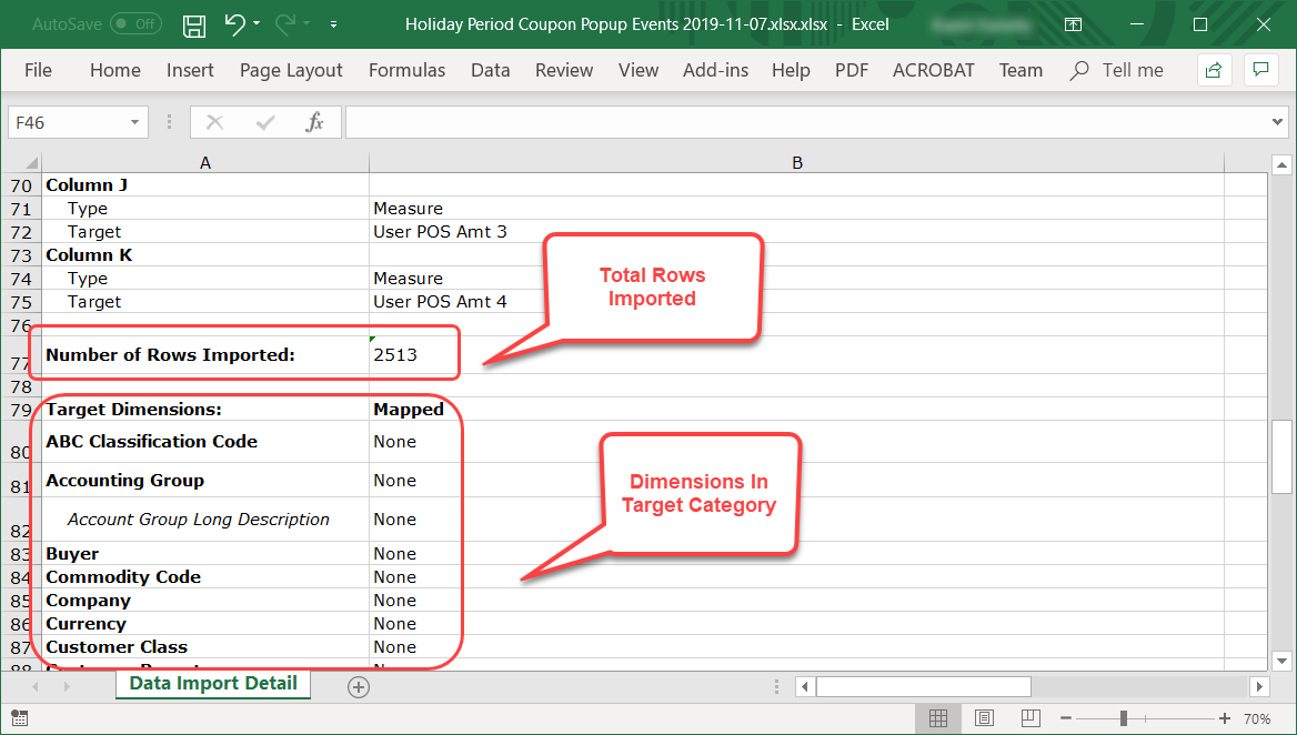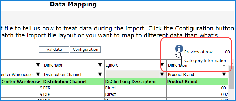 The details that show in the Target Dimensions section of the processing report are the same details that show when you click the Category Information button in the Data Mapping window while setting up your import.