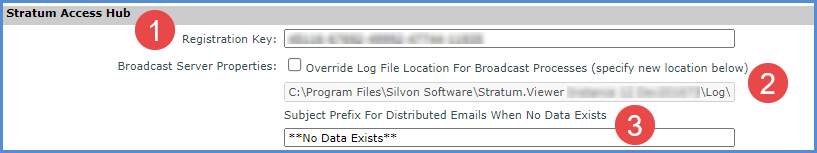 Registration Key – A valid key is required to activate licensed copies of the Stratum Access Hub which includes the Broadcast Server (controls broadcast schedules, broadcast groups, and actions processing) plus Excel and Stratum Power BI Connectors. If you receive a message about a missing or invalid key, contact Silvon Support at (800) 474-5866 or CustomerSupport@silvon.com. If your company is not using this functionality, leave this key field blank. |