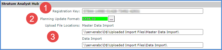 Registration Key – A valid key is required to activate licensed instances of the Stratum Analyst Hub, which provides Planning and Data Import functionality. If you receive a message about an invalid key, contact Silvon Support at (800) 474-5866 or CustomerSupport@silvon.com. If your company is not using this functionality, leave this key field blank. |