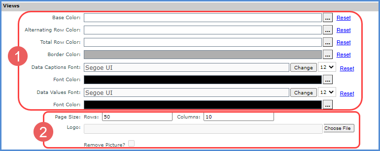 Page Size, Rows and Columns - Controls how many rows and columns display per page for views that use paging. Enter a numeric value in the Rows and Columns fields. Security administrators can define different view page sizes for particular users through User Profile settings. Individual users can override administrator settings and define their own, custom view page sizes for all views through an override setting in their User Options or for individual views through a view’s Display Options. Logo – Optionally specify an image to display as a logo in views. The image will display near the view name in the grid when users run views. Click the Choose File button to navigate to the image, then click Open in the Choose File window to upload a copy of the image. The image file will be copied to the Viewer application folder. To remove a logo, select the Remove Picture? checkbox. |