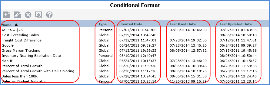2. Click OK to close the Display Options window and redisplay the Conditional Format list window with the selected information displayed. In the below example, Name, Global, Created Date, Last Used Date, and Last Updated Date checkboxes were selected on the Display Options window.
