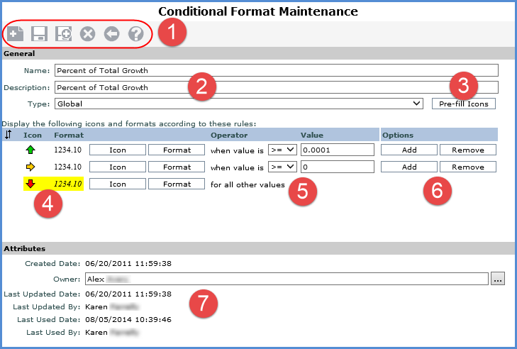 Attributes – This section shows the attributes of the conditional format, including when it was last updated and last used. When you create, update, or use a conditional format, this information is automatically updated by Stratum.Viewer. The Owner property in the Attributes section can be used by administrators to change the owner of a conditional format. Administrators can click the Browse button next to the property and use a Select