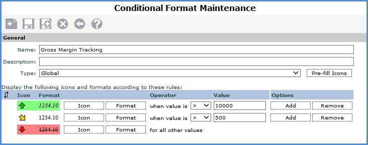 7. Continue defining additional rules. In the example that follows, three rules have been defined for the Gross Margin Tracking conditional format.