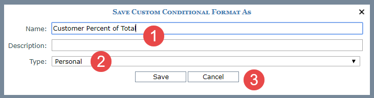 Type – Controls whether the conditional format will be global or personal. Type defaults to Personal and is disabled for advanced users. Administrators can set the Type to Global or Personal. |