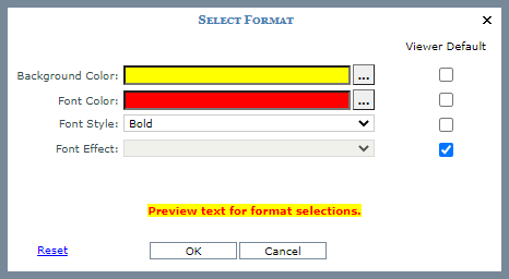Preview Text – The text displayed here is formatted to show an example of the formatting you have selected. Reset – Click to reset the window to use Viewer defaults, which means the Viewer Default checkboxes will be selected for all properties and any custom selections will be removed. OK – Click to save any edits made on this window and close the window. Cancel – Click to close the window without making any changes. |