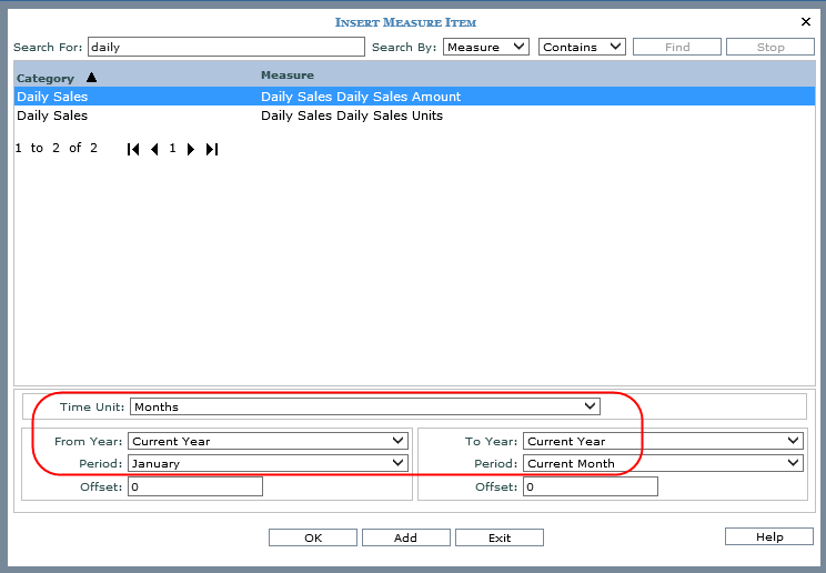 Here are the properties for a measure item with a time range. The measure item is based on the Daily Sales Daily Sales Amount measure from the Daily Sales category.