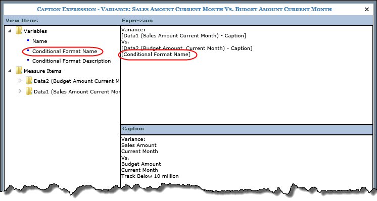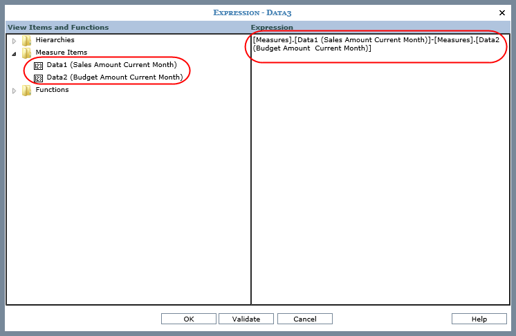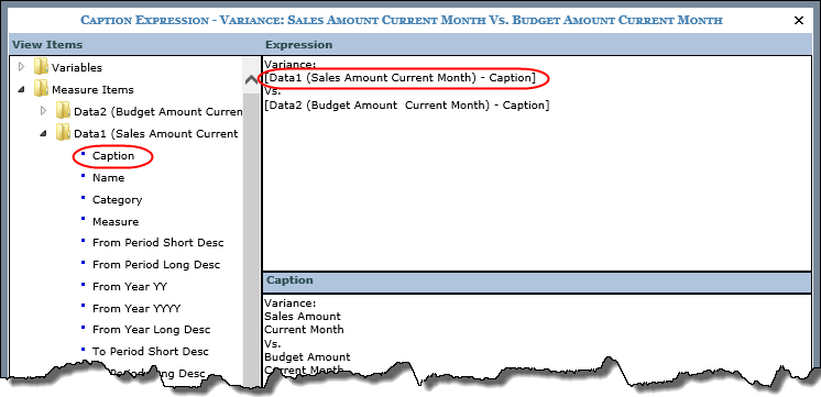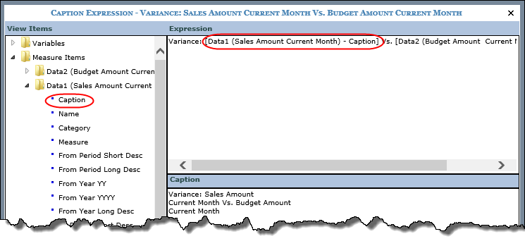 Here is an expression for a calculated measure item that uses two other measure items in a view to perform its calculation. In the examples that follow, caption variables from a sales amount and budget amount measure item in the view will be used to generate the caption for the calculated measure item.